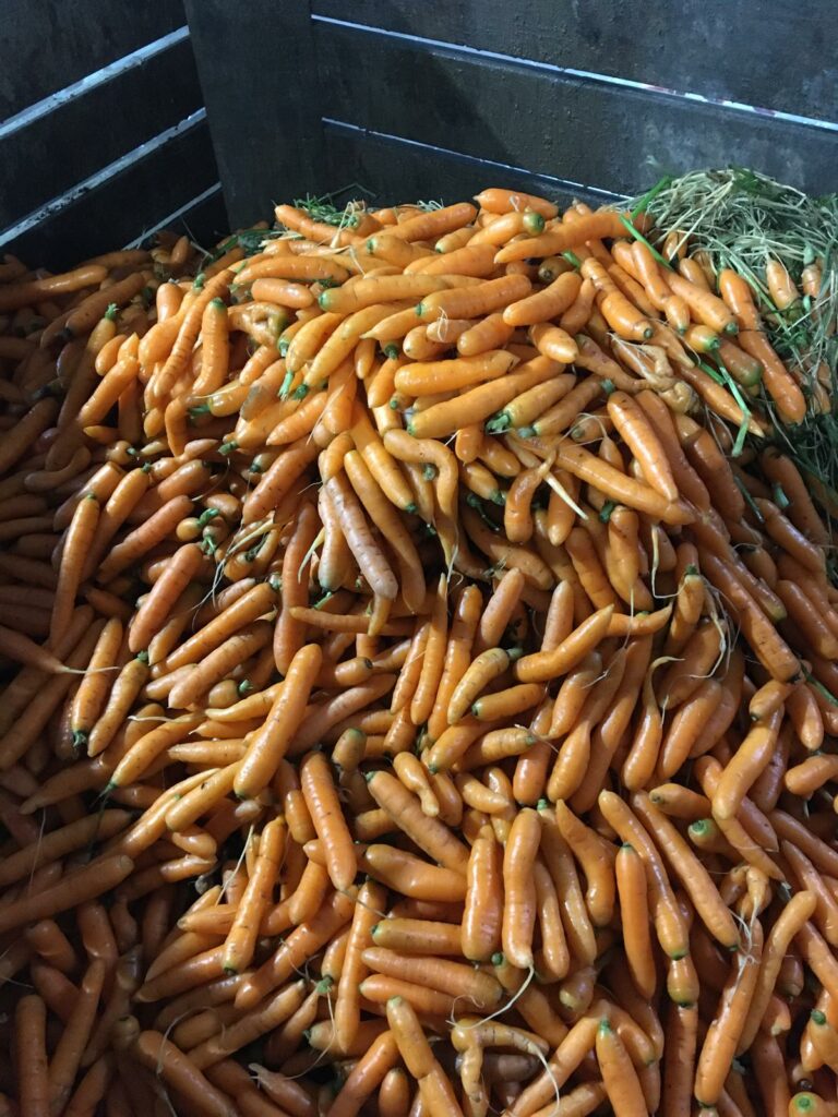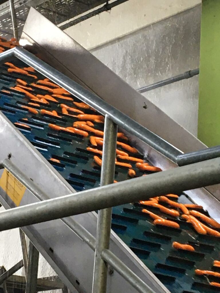 Das größte „Schauspiel“ ist aber die Reinigung, Sortierung und Verpackung der Karotten. Ca 40-60 Tonnen werden jeden Tag verarbeitet. Die Gärtner bringen die Karotten direkt vom Feld mit Erde ungewaschen.
