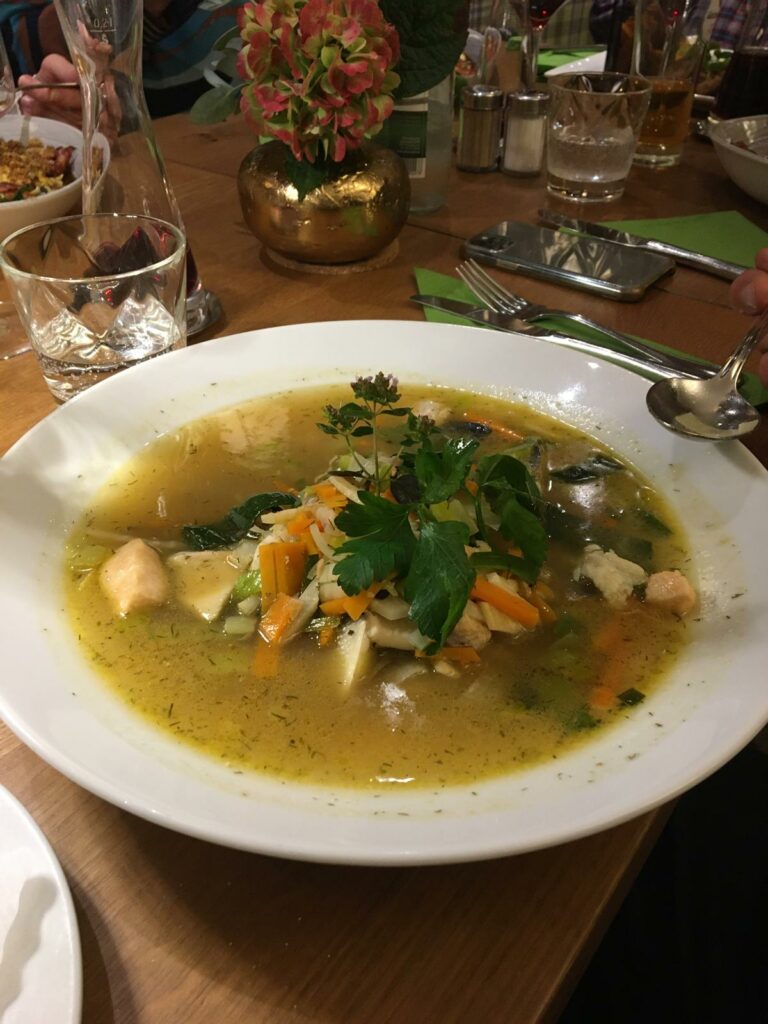 Nach diesen Eindrücken wurden wir im Gasthof Sonne von der Familie Hander verwöhnt. Die Fischsuppe mit Forelle, Lachsforelle und Zander war delikat, sehr schmackhaft gut durchgezogen und sowohl mit Gemüse und auch Fisch vom eigenen Teich versorgt.