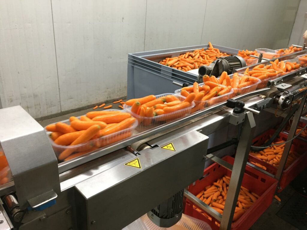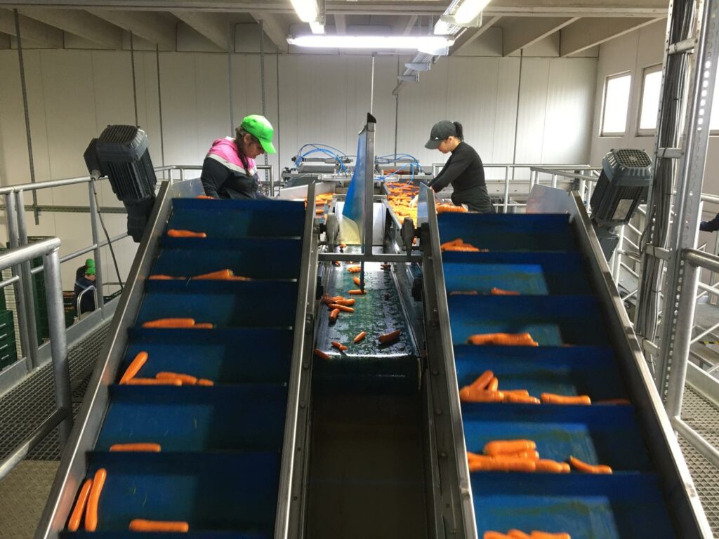 Die große Anlage wäscht, sortiert nach genauen Vorgaben der Kunden die Karotten aus und dann werden sie entsprechend verpackt. In Summe werden ca. 25 % der Karotten aussortiert.